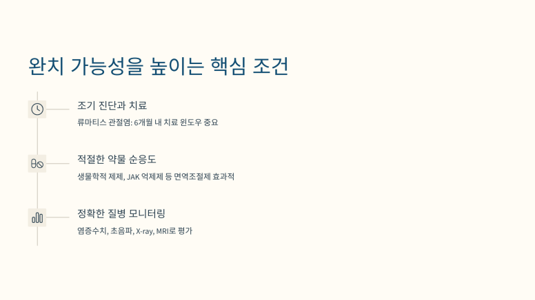 ํ์์ ์ฝ๋ฌผ ๋ณต์ฉ ์์๋(compliance)๋ ์น๋ฃ์ ์ฑํจ๋ฅผ ๊ฒฐ์ ํฉ๋๋ค. ์๋ฌผํ์ ์ ์ (TNF-α ์ต์ ์ , IL-6 ์ต์ ์ ๋ฑ), JAK ์ต์ ์ ๋ฑ ์ต์ ๋ฉด์ญ์กฐ์ ์ ๋ ์น๋ฃ ๋ฐ์๋ฅ ์ด ๋์ผ๋ฉฐ, ์ฅ๊ธฐ์ ๊ดํด๋ฅผ ์ ๋ํ๋ ๋ฐ ํจ๊ณผ์ ์