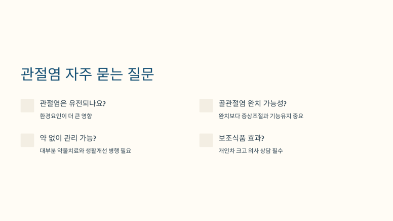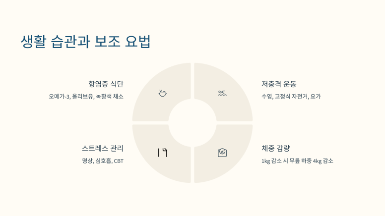 A4. ๊ธ๋ฃจ์ฝ์ฌ๋ฏผ, ์ฝ๋๋ก์ดํด, MSM ๋ฑ์ ์ผ๋ถ ํ์์์ ํต์ฆ ์ํ ํจ๊ณผ๊ฐ ๋ณด๊ณ ๋๊ณ ์์ผ๋, ํจ๊ณผ๋ ๊ฐ์ธ์ฐจ๊ฐ ํฝ๋๋ค. ๋ฐ๋์ ์ฃผ์น์ ์๋ด ํ ์ญ์ทจํ์๊ธฐ ๋ฐ๋๋๋ค. — ๊ด์ ์ผ์ ๋จ์ํ ํต์ฆ๋ง์ ๋ฌธ์ ๊ฐ ์๋๋๋ค. ์ง๊ธ์ ์ ํ์ด 10๋ ํ ๊ด์ ๊ฑด๊ฐ์ ์ข์ฐํ ์ ์์ต๋๋ค. ์กฐ๊ธฐ์ ์ ํํ ์ง๋จ์ ๋ฐ๊ณ , ์ฒด๊ณ์ ์ธ ์น๋ฃ์ ์ํ ๊ด๋ฆฌ๋ฅผ ๋ณํํ๋ค๋ฉด ๊ด์ ์ผ์ ์์น์ ๋ ๊ฐ๊น์ด ๋ค๊ฐ๊ฐ ์ ์์ต๋๋ค.