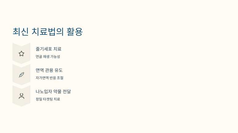 ์ค๊ธฐ์ธํฌ ์น๋ฃ, ๋ฉด์ญ ๊ด์ฉ ์ ๋(immune tolerance), ๋๋ ธ์ ์ ๊ธฐ๋ฐ ์ฝ๋ฌผ ์ ๋ฌ ํ๋ซํผ ๋ฑ์ ํ์ฌ ์์ ์ฐ๊ตฌ ๋จ๊ณ์ด์ง๋ง, ํฅํ ๊ด์ ์ผ ์น๋ฃ์ ํ๋๋ฅผ ๋ฐ๊ฟ ์ ์๋ ๊ฐ๋ฅ์ฑ์ ์ ์ํ๊ณ ์์ต๋๋ค. ๊ตญ๋ด ์ผ๋ถ ๋ณ์์์๋ ์๊ฐ ์ค๊ธฐ์ธํฌ๋ฅผ ์ด์ฉํ ์ฐ๊ณจ ์ฌ์ ์์ ์ ์๋ฒ์ ์ผ๋ก ์ํ ์ค์ด๊ธฐ๋ ํฉ๋๋ค.