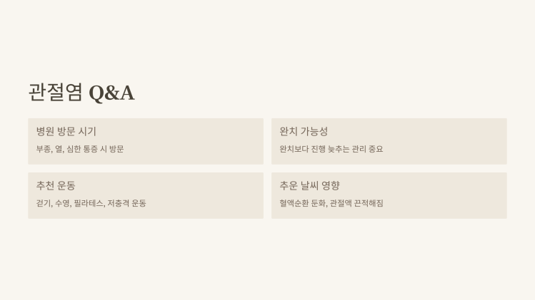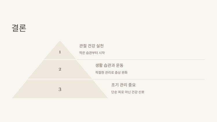 ๊ด์ ํต์ฆ์ ๋จ์ํ ํผ๋ก๊ฐ ์๋๋ผ ์ด๊ธฐ์ ๊ด๋ฆฌํด์ผ ํ ์ ํธ์ผ ์ ์์ต๋๋ค. ํนํ ๊ด์ ์ผ์ด ์์ฌ๋๋ค๋ฉด ์ ์ ํ ์ํ ์ต๊ด๊ณผ ์ด๋, ๋ณ์ ๊ฒ์ง์ ๋ณํํ๋ ๊ฒ์ด ์ค์ํฉ๋๋ค.
