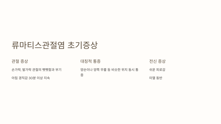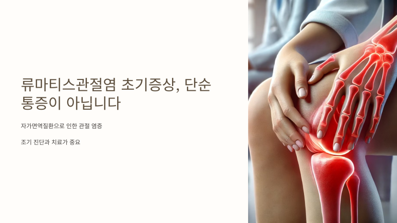 ๋จ์ํ ํต์ฆ์ฒ๋ผ ๋๊ปด์ง๋ ์ฆ์๋ ๋ฅ๋งํฐ์ค๊ด์ ์ผ์ ์ ํธ์ผ ์ ์์ต๋๋ค. ํ๋ฃจํ๋ฃจ์ ํต์ฆ์ ๋ฌด์ฌ์ฝ ๋๊ธฐ์ง ๋ง๊ณ , ์ด๊ธฐ ์ฆ์์ ์ ํํ ์๊ณ ์กฐ๊ธฐ ์ง๋จ์ ๋ฐ๋ ๊ฒ์ด ๊ด์ ๊ณผ ์ถ์ ์งํค๋ ์ฒซ๊ฑธ์์