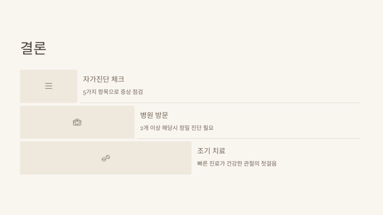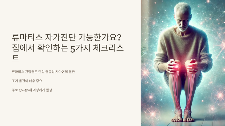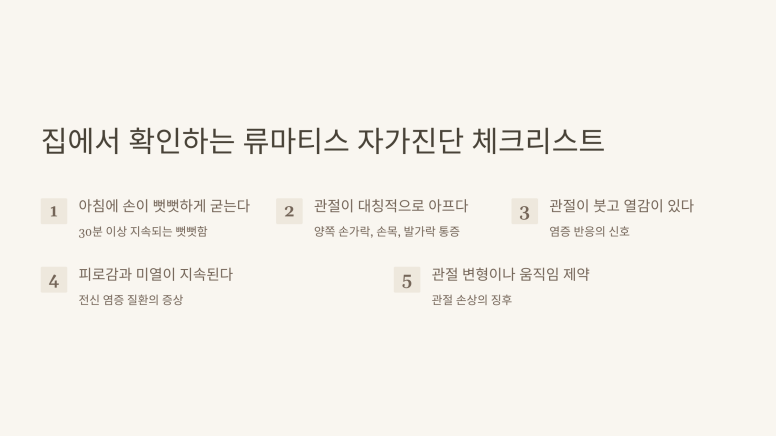 λ₯λ§ν°μ€ κ΄μ μΌμ μ‘°κΈ°μ λ°κ²¬νκ³ μΉλ£λ₯Ό μμνλ κ²μ΄ 무μλ³΄λ€ μ€μν©λλ€. μμμ μκ°ν 5κ°μ§ μκ°μ§λ¨ 체ν¬λ¦¬μ€νΈλ₯Ό ν΅ν΄ μμ μ μ¦μμ μ κ²ν΄λ³΄κ³ , ν΄λΉ νλͺ©μ΄ 2κ° μ΄μ ν΄λΉλλ€λ©΄ λ³μμ μ°Ύμ μ λ° μ§λ¨μ λ°μ보μκΈΈ κΆμ₯ν©λλ€.