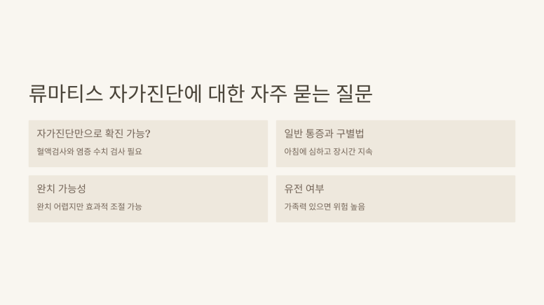 A1. μκ°μ§λ¨μ μ°Έκ³ μ©μ΄λ©°, νμ§μ λ°λμ νμ‘κ²μ¬(RF, anti-CCP) λ° μΌμ¦ μμΉ κ²μ¬(CRP, ESR)λ₯Ό ν΅ν΄ μ΄λ€μ ΈμΌ ν©λλ€.